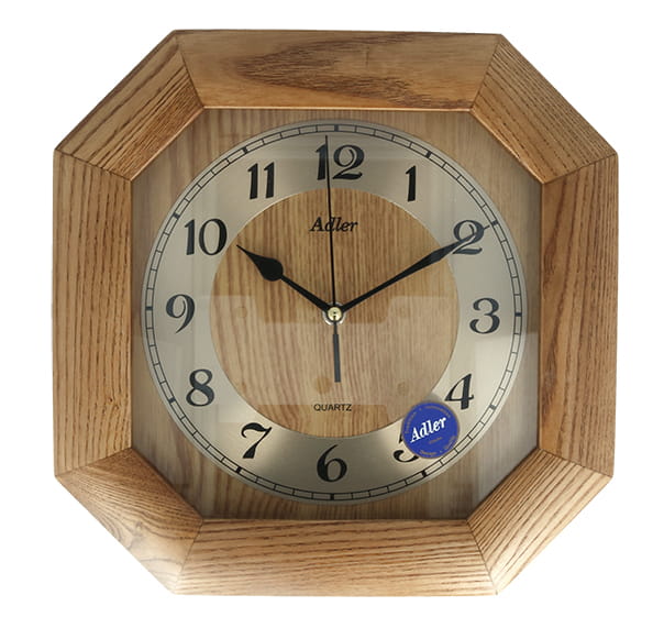 Zegar posiada drewnianą ramę wyprofilowaną na kształt ośmioboku. Przyjemna, jasna barwa drewna w kolorze dębu, z licznymi dekoracyjnymi usłojeniami. Cyferblat schowany za szybką. Poruszające się po cyferblacie czarne wskazówki są doskonale widoczne. Metaliczna tarcza w matowym odcieniu wyposażona jest w duże i czytelne cyfry arabskie. W dokładnym odczycie aktualnej godziny pomocna okaże się precyzyjna podziałka sekundowa / minutowa. Wskazówka sekundnika porusza się trybem skokowym. Za pracę czasomierza odpowiada wysokiej jakości mechanizm kwarcowy zasilany bateryjnie (R6 – popularny paluszek).