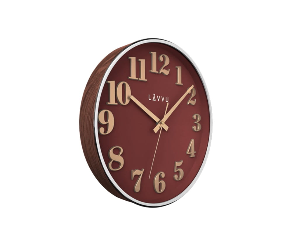 Obudowa wykonana z tworzywa sztucznego ozdobiona jest okleiną z imitacją ciemnego drewna i srebrzystym rantem z przodu. Czerwony cyferblat doskonale współgra z kolorystką cyfr i wskazówek w odcieniu różowego złota. W odczytaniu parametrów wskazań zegara ułatwiają cyfry naniesione techniką 3D. Logo LAVVU umieszczone na cyferblacie pod szklaną szybką subtelnie reklamuje markę.