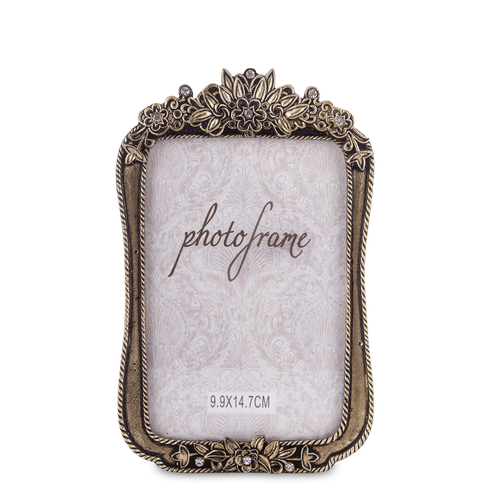 Antyczna ramka w kolorze złotym, patynowana, metalowa. Ramka idealnie wkomponuje się do wnętrza w antycznym. Posiada podpórkę, dzięki której można ją ustawić w dowolnym miejscu, na komodzie lub kominku. Doskonała dekoracja wnętrza. Ramka zapakowana jest w oryginalne opakowanie, dzięki czemu idealnie nadaje się na prezent.