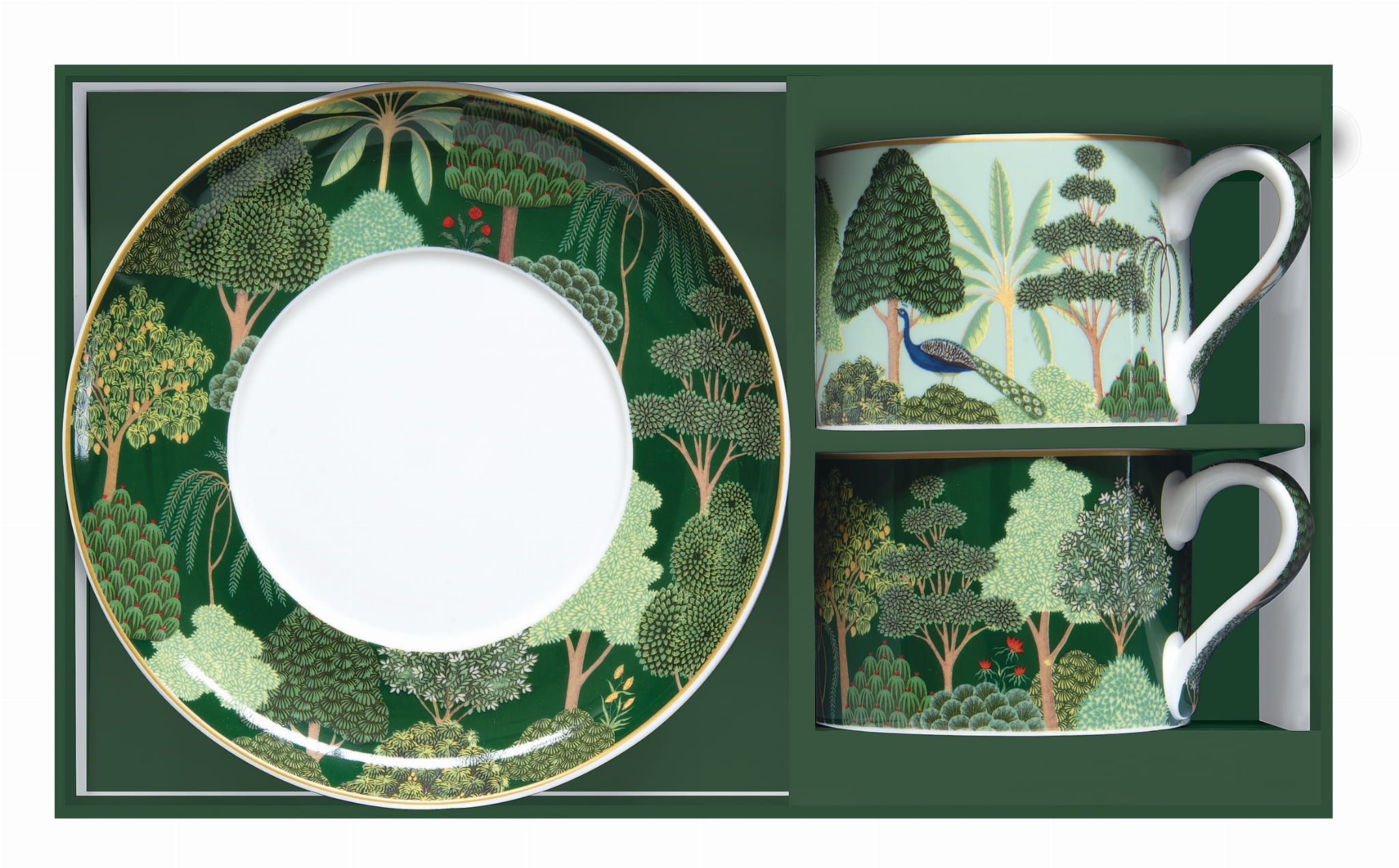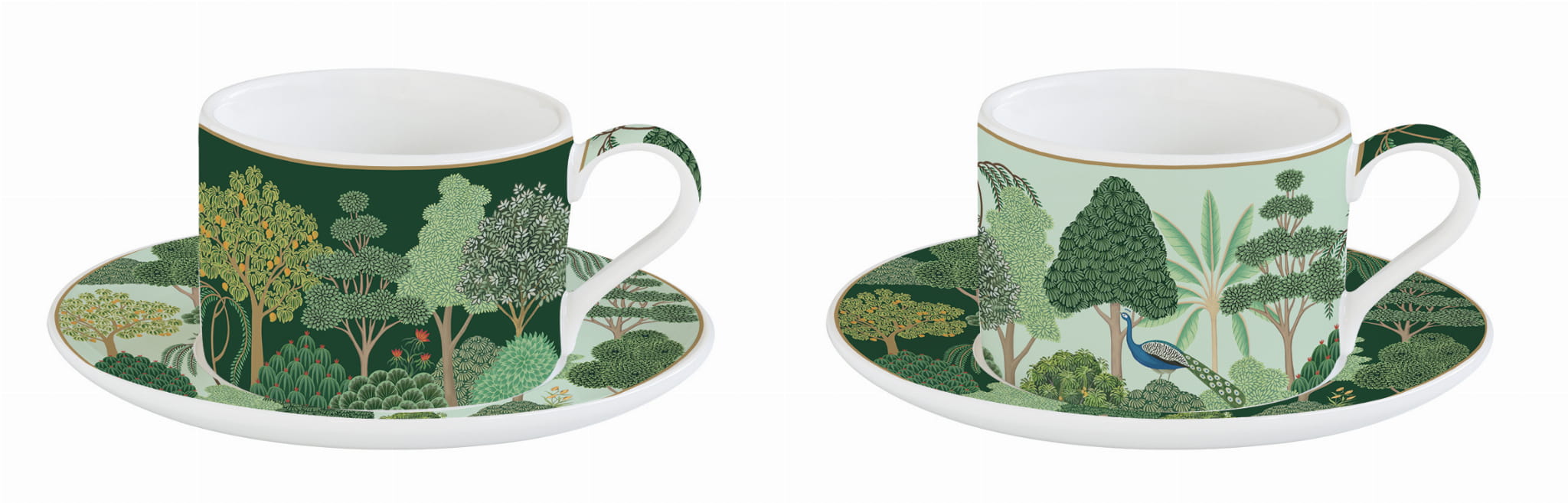 Każda filiżanka zachwyca detalicznym nadrukiem przedstawiającym bujną roślinność, drzewa i egzotyczne ptaki, a głęboka zieleń i subtelne złocenia dodają elegancji i głębi kompozycji. Wykonane z wysokogatunkowej porcelany, filiżanki o pojemności 240 ml doskonale nadają się do serwowania kawy, herbaty, cappuccino czy gorącej czekolady.